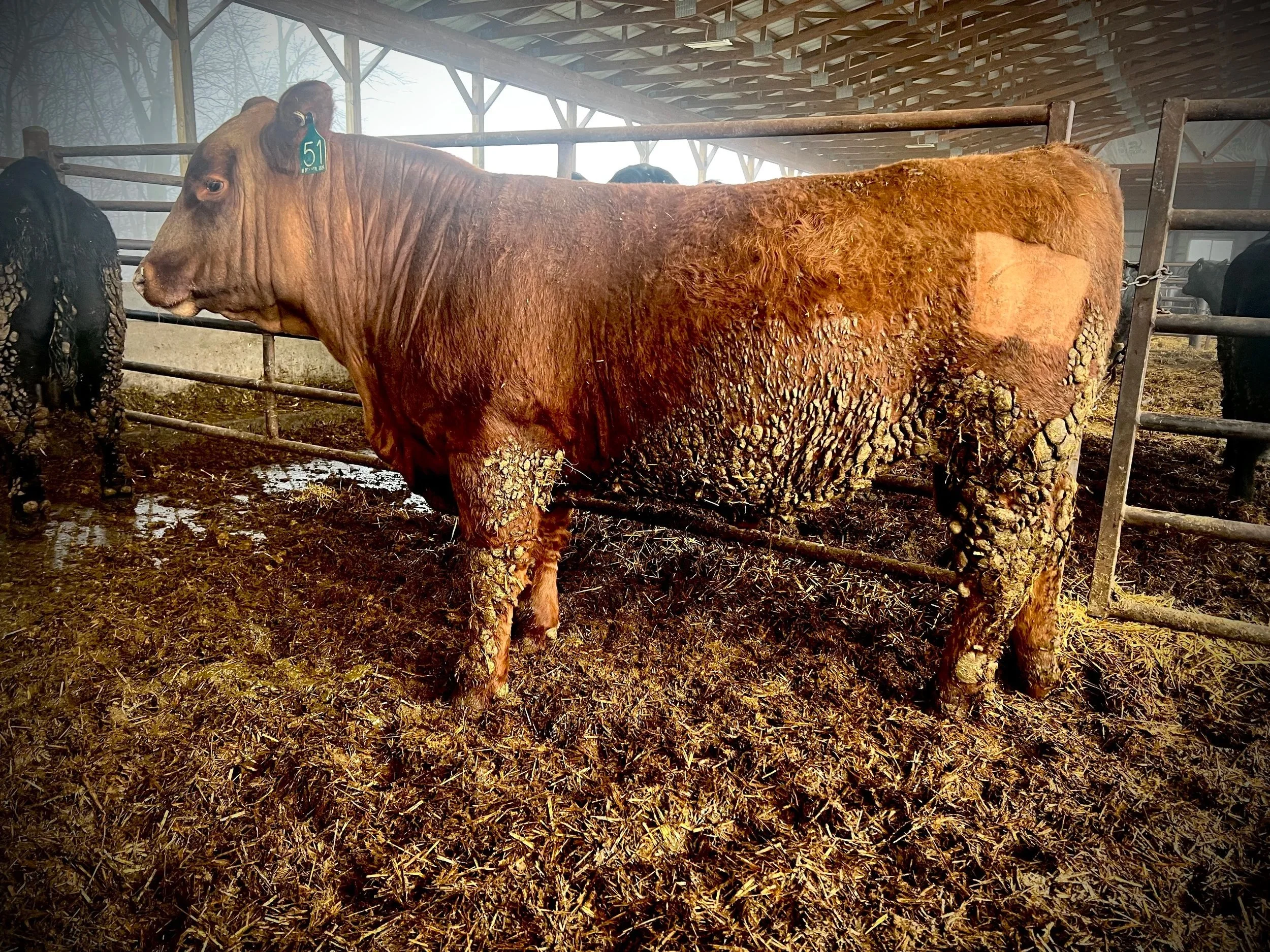 Lot 51 has a balanced EPD package combining growth, carcass, and maternal traits. The more carcass-oriented of this duo, who can still make heifers worth retaining in your herd! He performed notably above average at the MCA/MSU Bull Test.